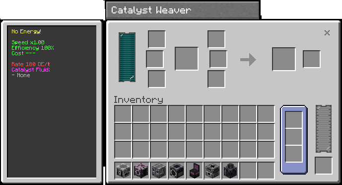 Advanced catalyst weaving: combines a base item, up to six catalysts, and optional fluid to produce a main output and possible byproduct.