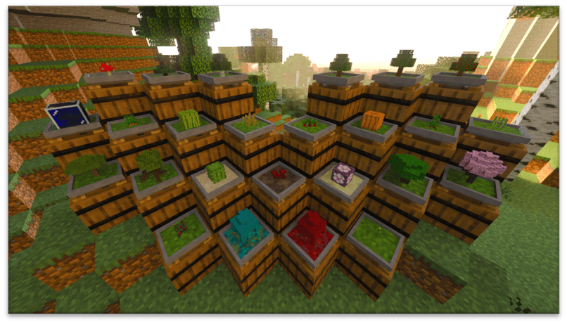 Grow every Minecraft tree in compact, beautiful containers that generate logs, leaves, sticks, saplings and special loot — all without consuming space or requiring manual farming.